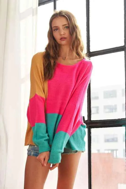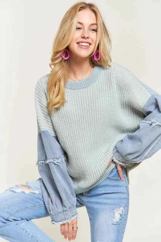ADORA Plus Size Frayed Denim Sleeve Sweater Top ADORA Plus Size Frayed Denim Sleeve Sweater Top