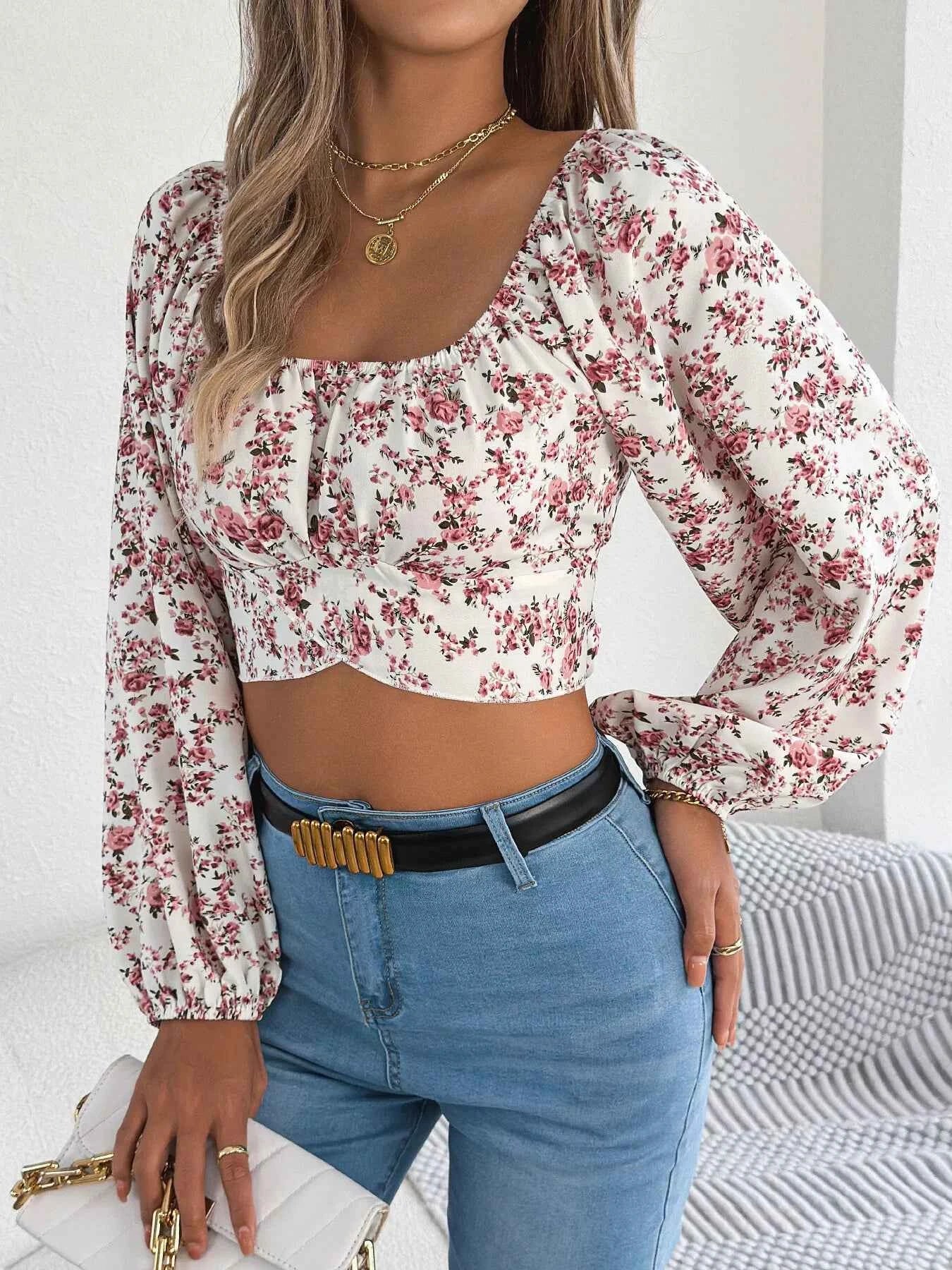 Floral Balloon Sleeve Square Neck Crop Blouse Floral Balloon Sleeve Square Neck Crop Blouse