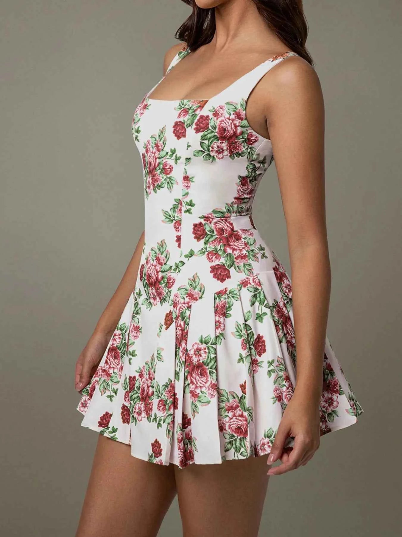 Pleated Floral Print Square Neck Mini Dress Pleated Floral Print Square Neck Mini Dress