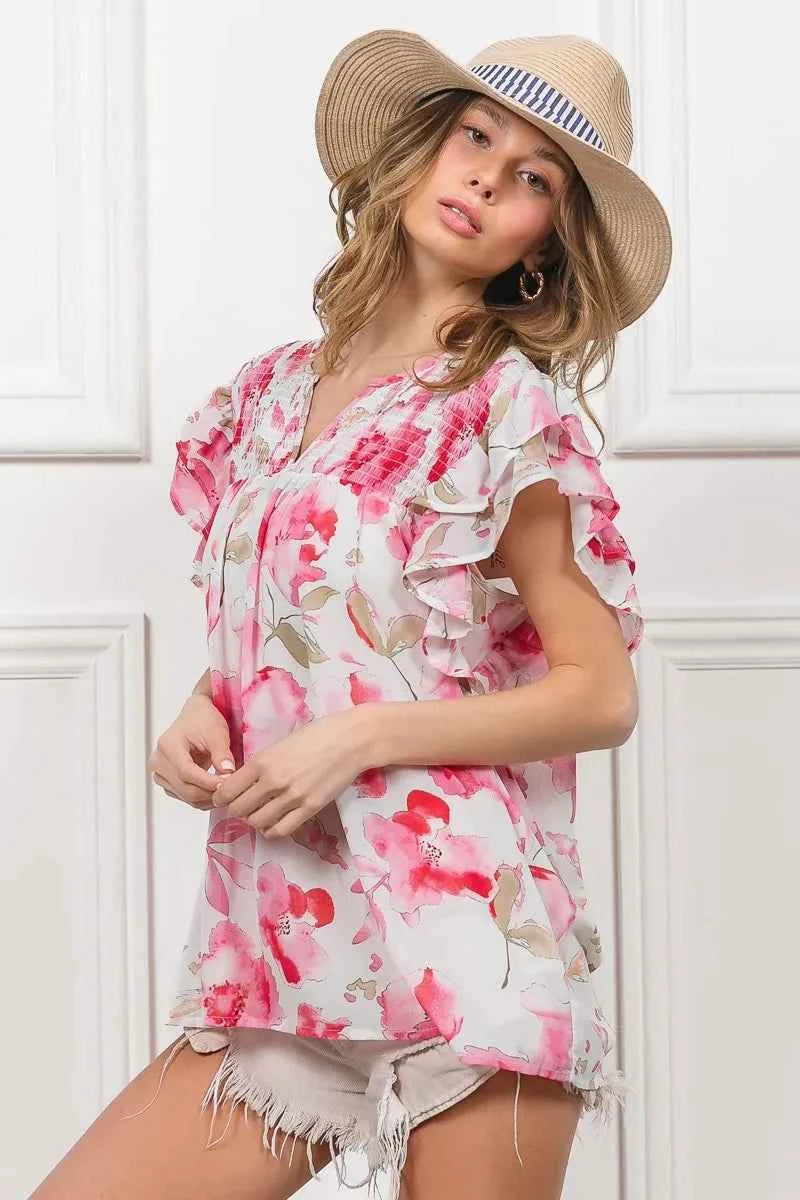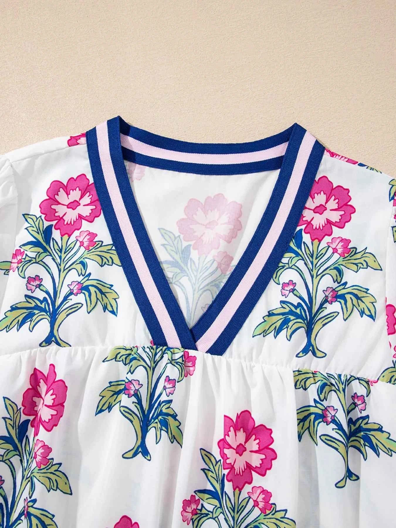 Floral Print Short Sleeve Blouse with Contrast Trim Floral Print Short Sleeve Blouse with Contrast Trim