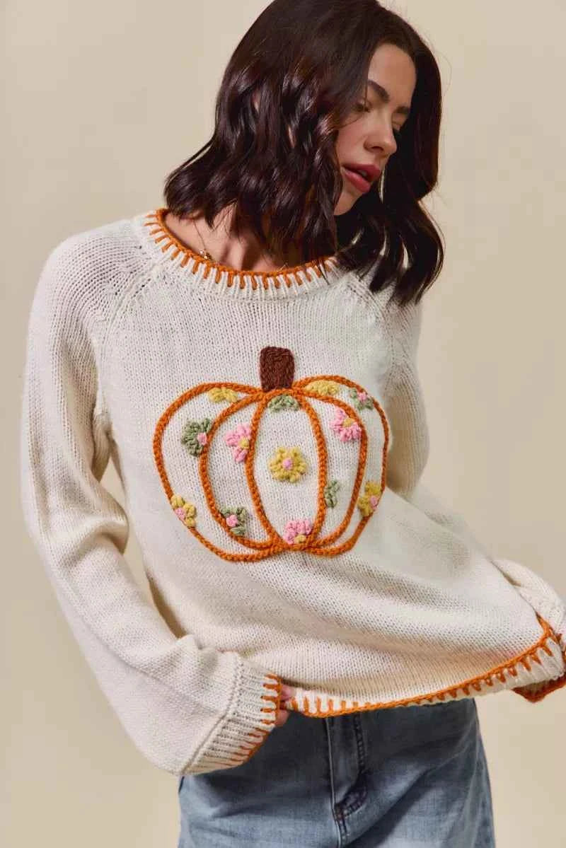 SO ME Pumpkin Floral Embroidered Thanksgiving Sweater SO ME Pumpkin Floral Embroidered Thanksgiving Sweater