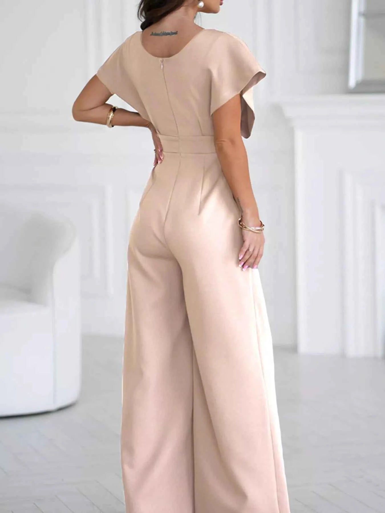 Button Front Half Sleeve Wide Leg Jumpsuit -
