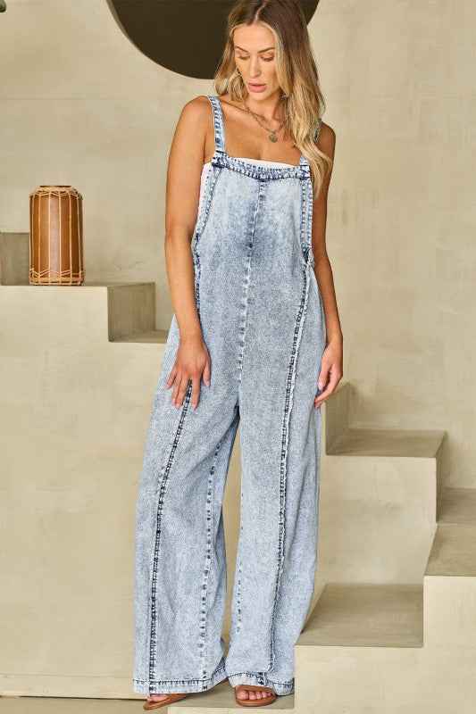 Denim Frayed Reverse Seam Wide Leg Overall Denim Frayed Reverse Seam Wide Leg Overall