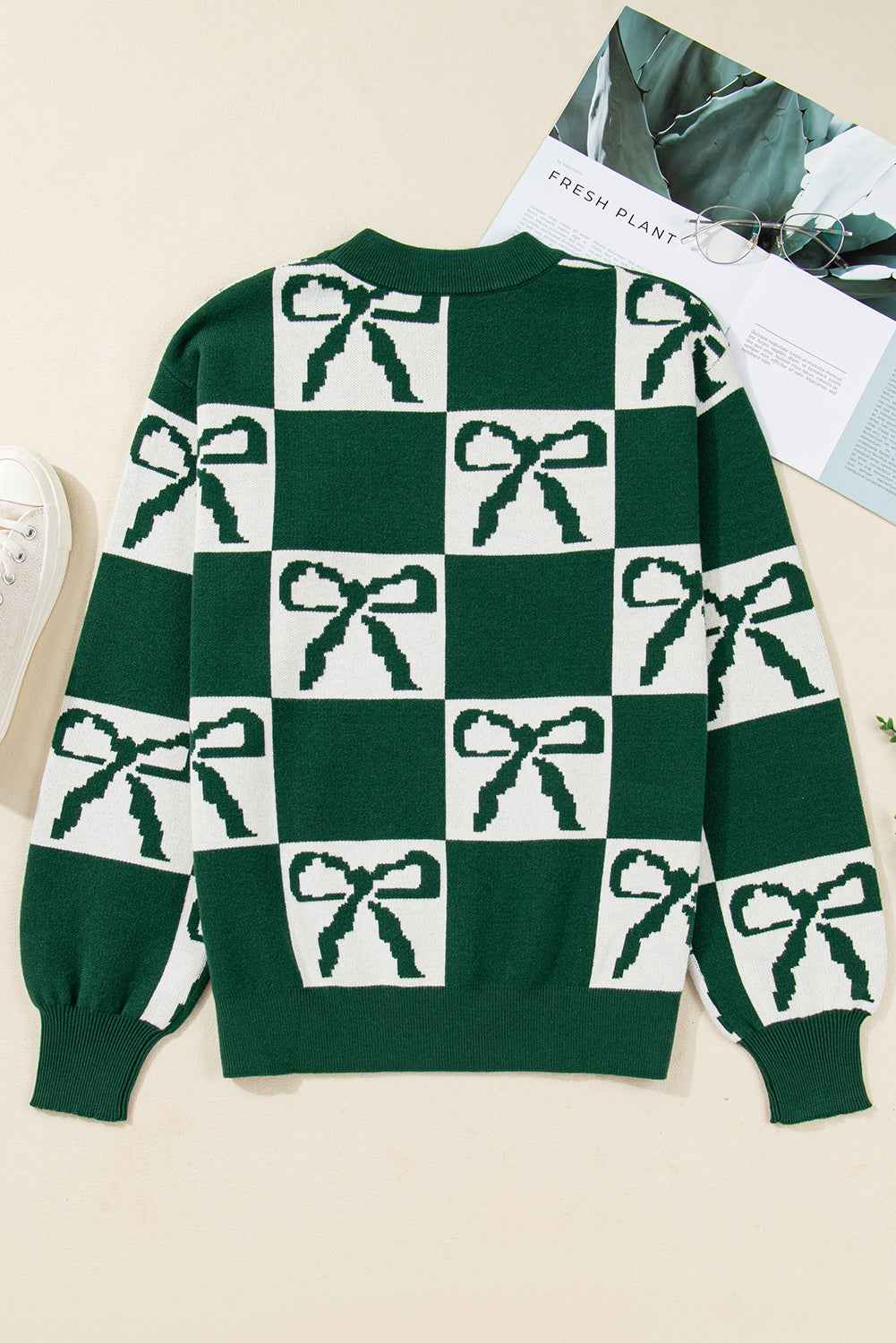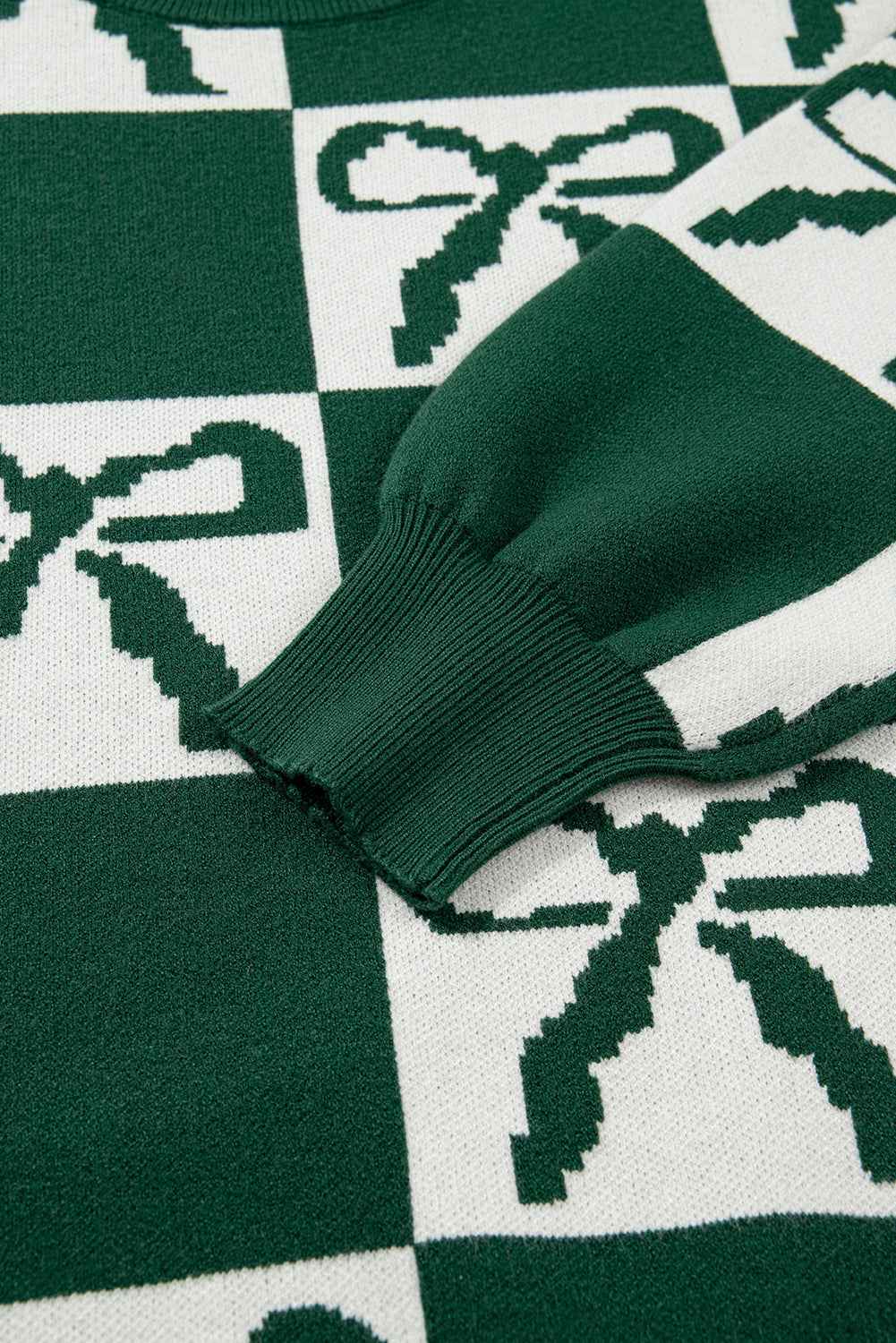 Blackish Green Bow Print Checkered Knit Sweater Blackish Green Bow Print Checkered Knit Sweater