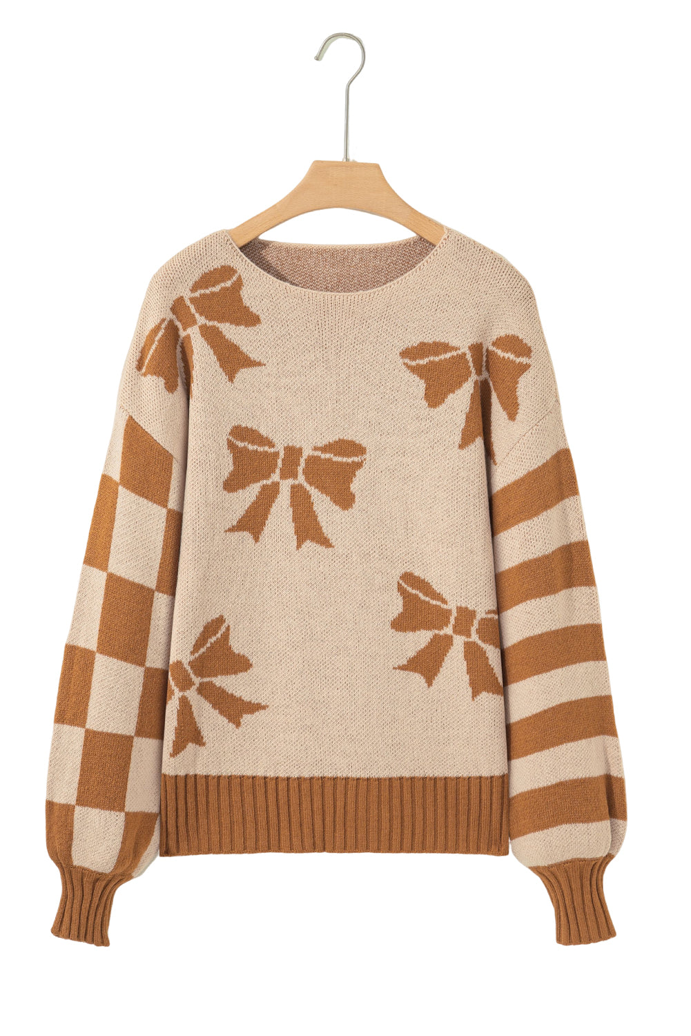 Straw Yellow Striped Checkered Sleeves Bow Print Knit Sweater Straw Yellow Striped Checkered Sleeves Bow Print Knit Sweater