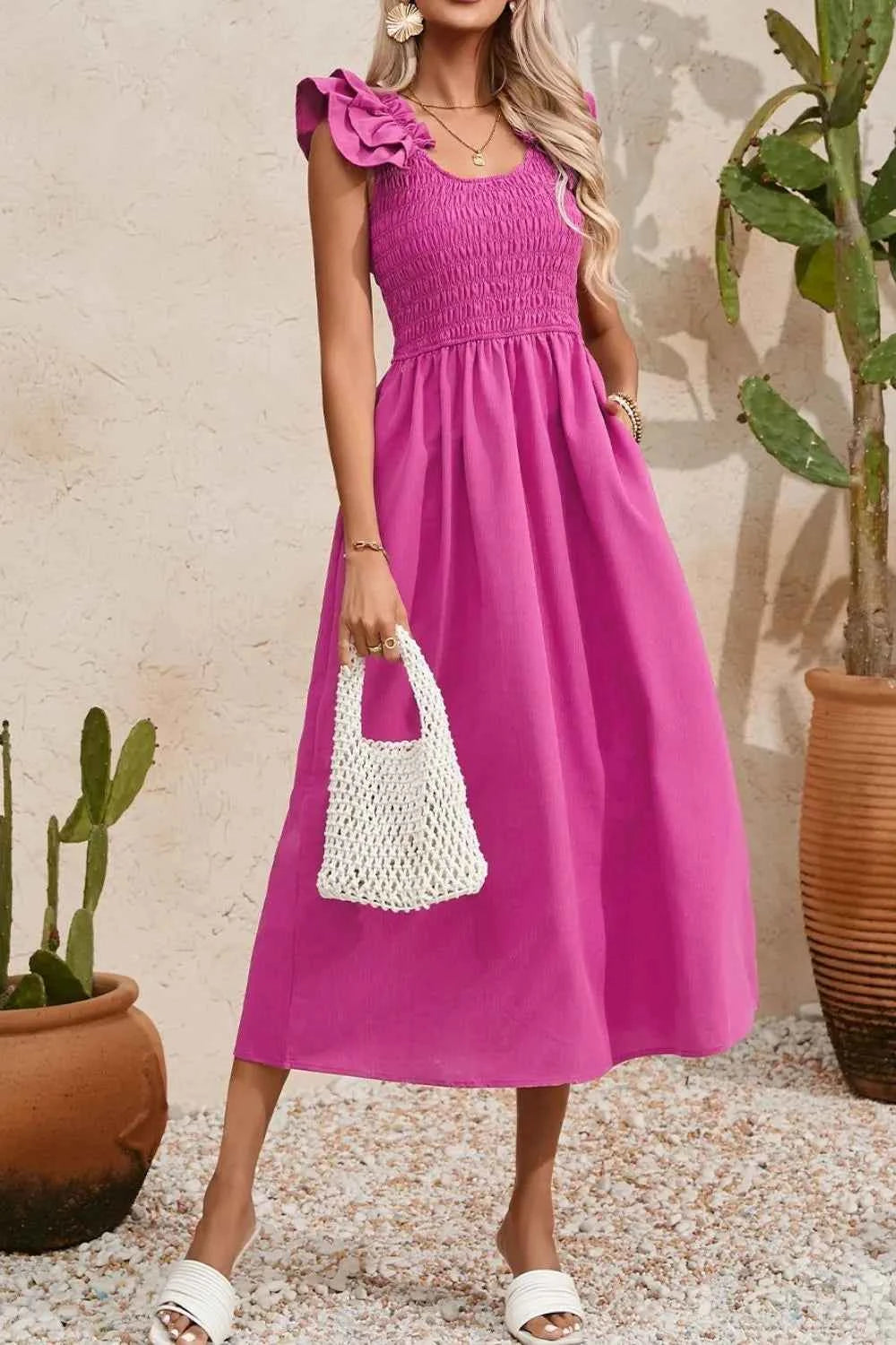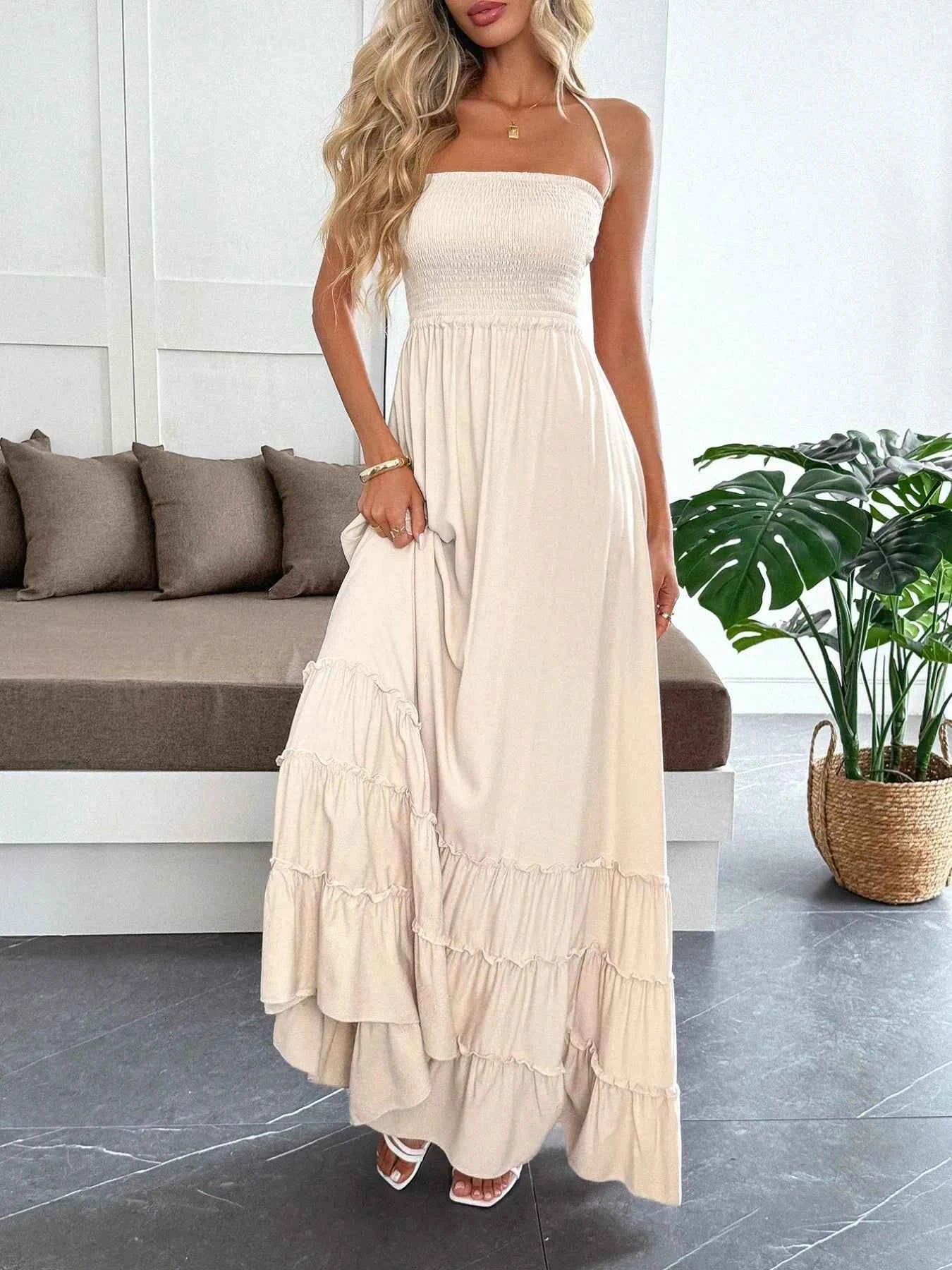 Solid Color Ruffled Straps Smocked Ruched Maxi Dress Solid Color Ruffled Straps Smocked Ruched Maxi Dress