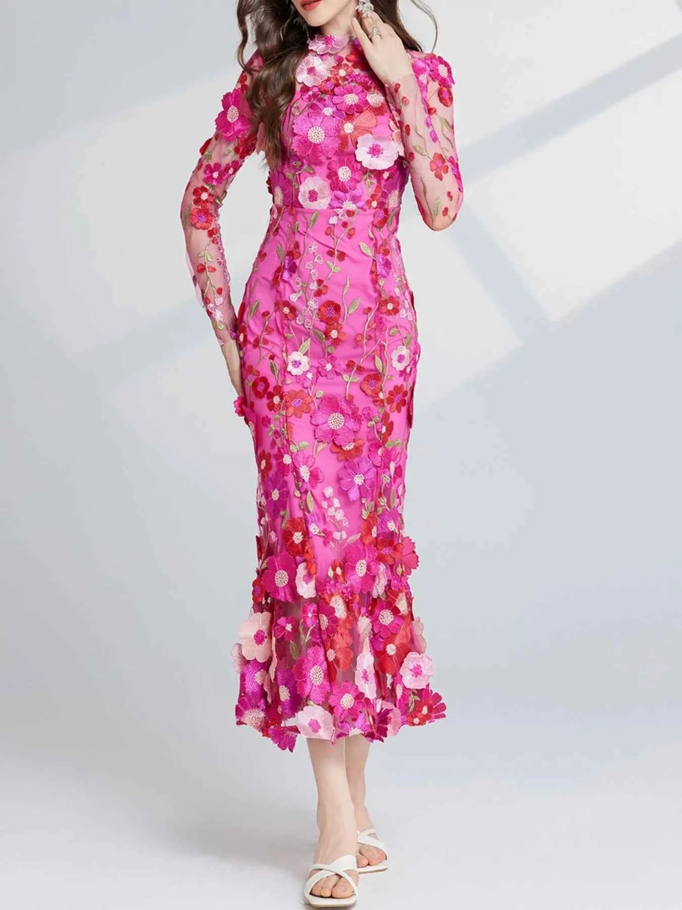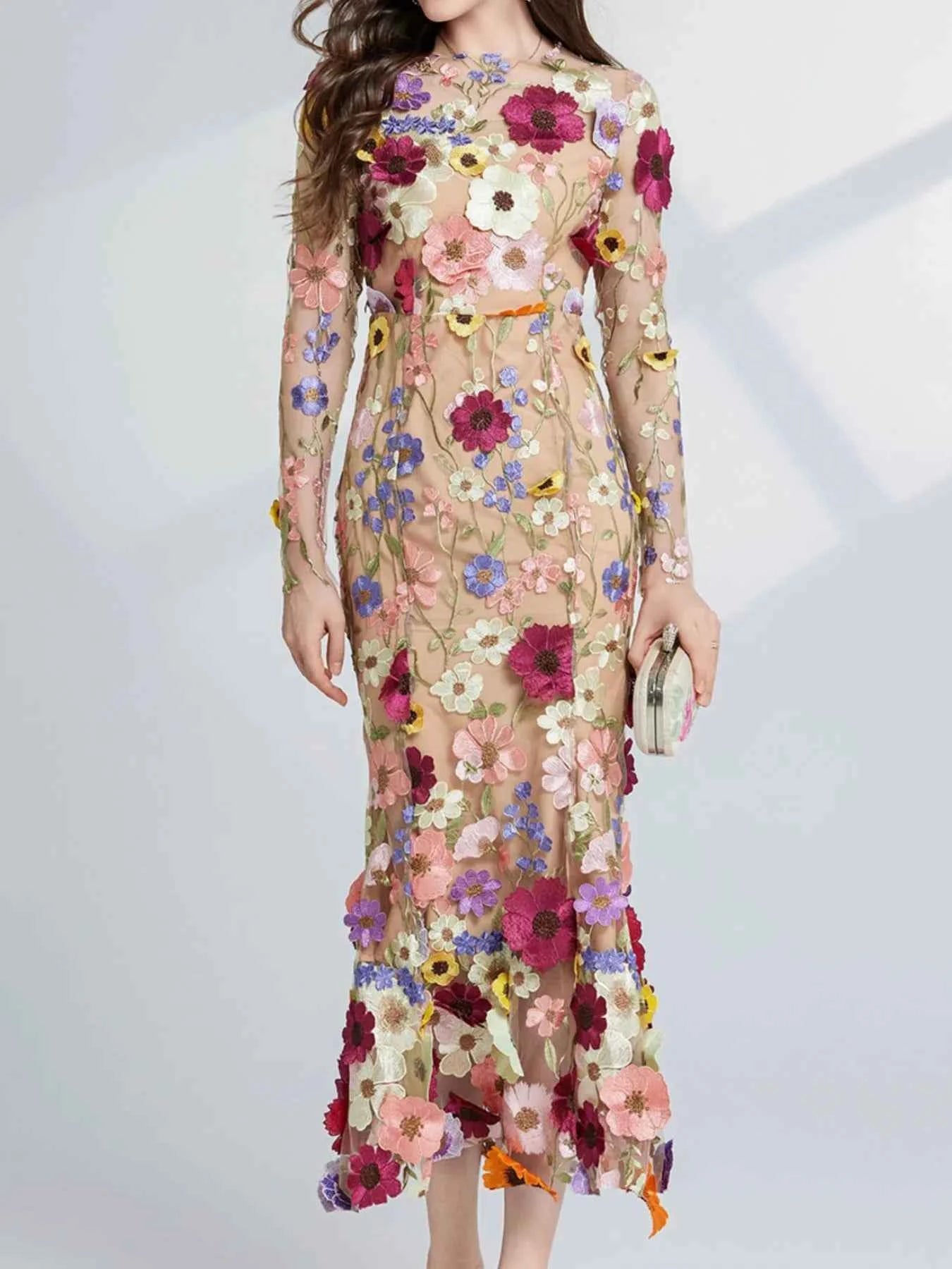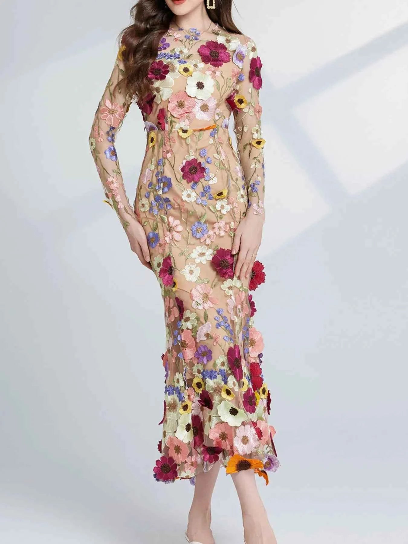 Floral Embroidered Mesh Long Sleeve Midi Dress Floral Embroidered Mesh Long Sleeve Midi Dress