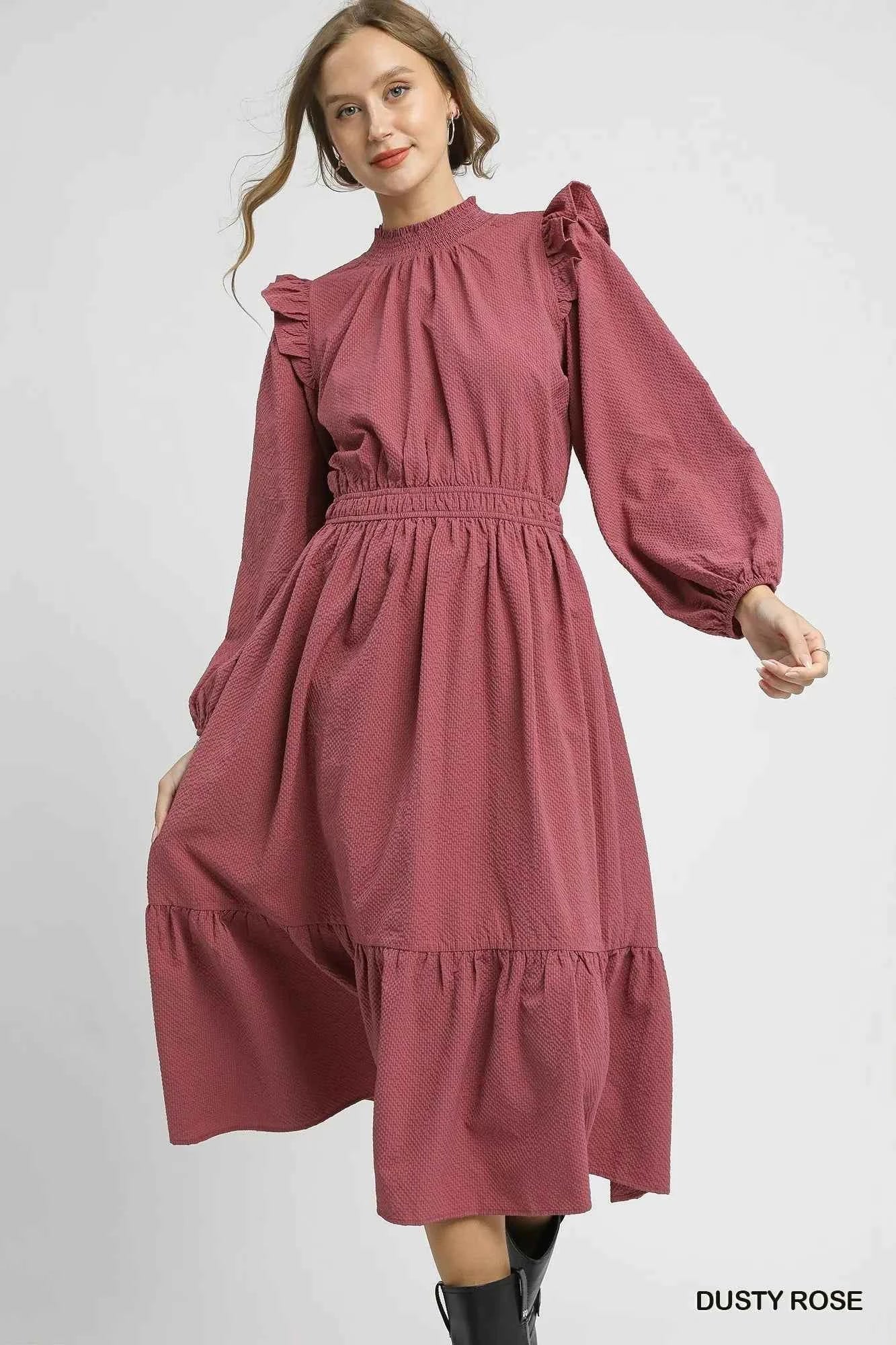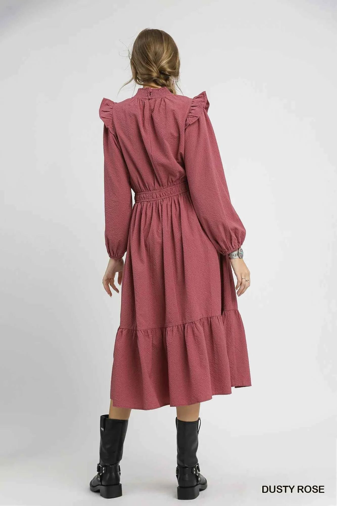 Umgee Textured Midi Dress with Ruffle Shoulder Detail Umgee Textured Midi Dress with Ruffle Shoulder Detail