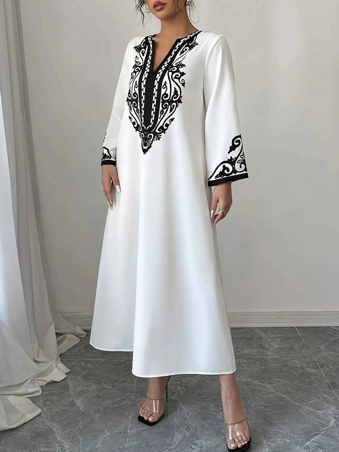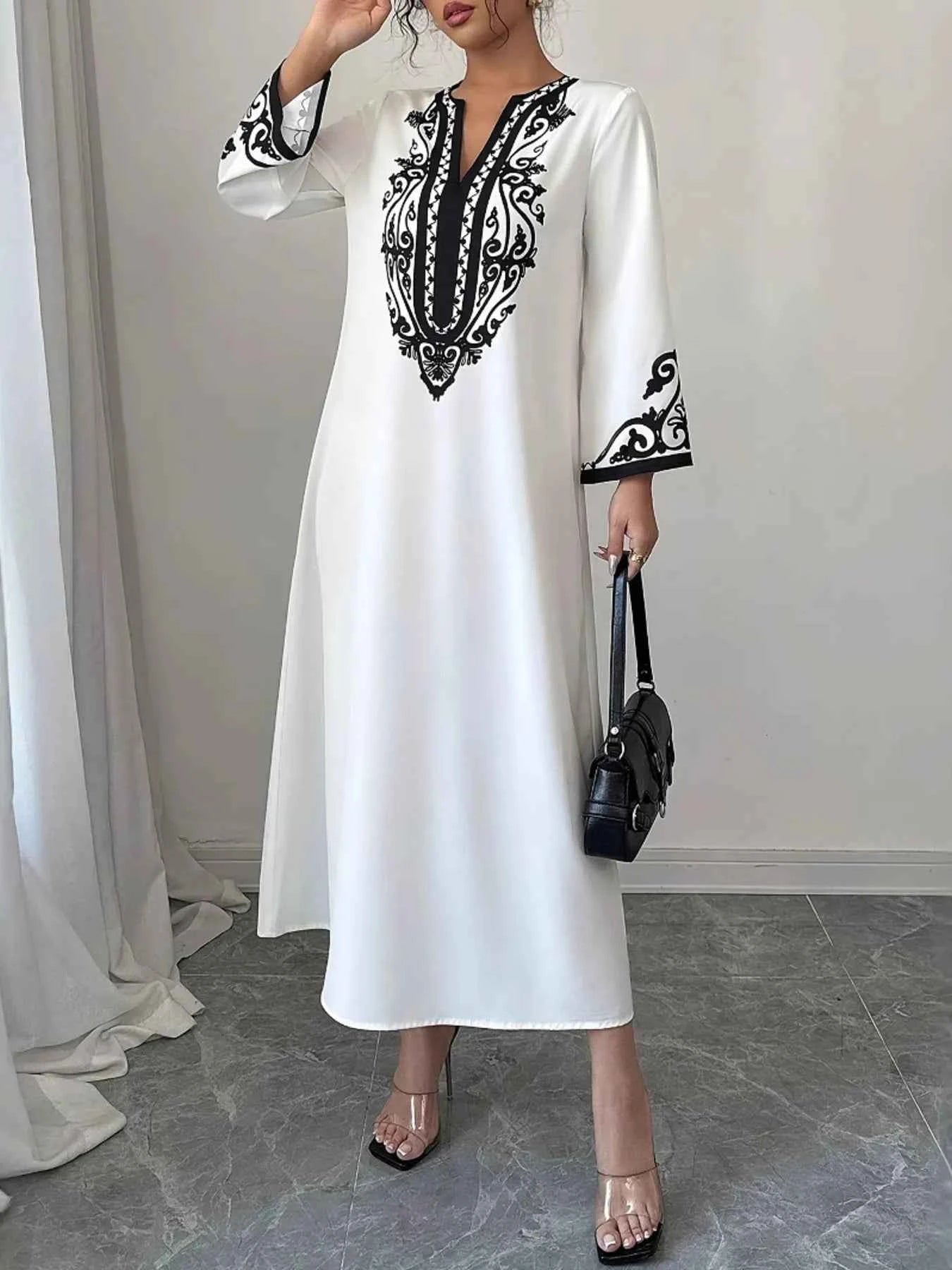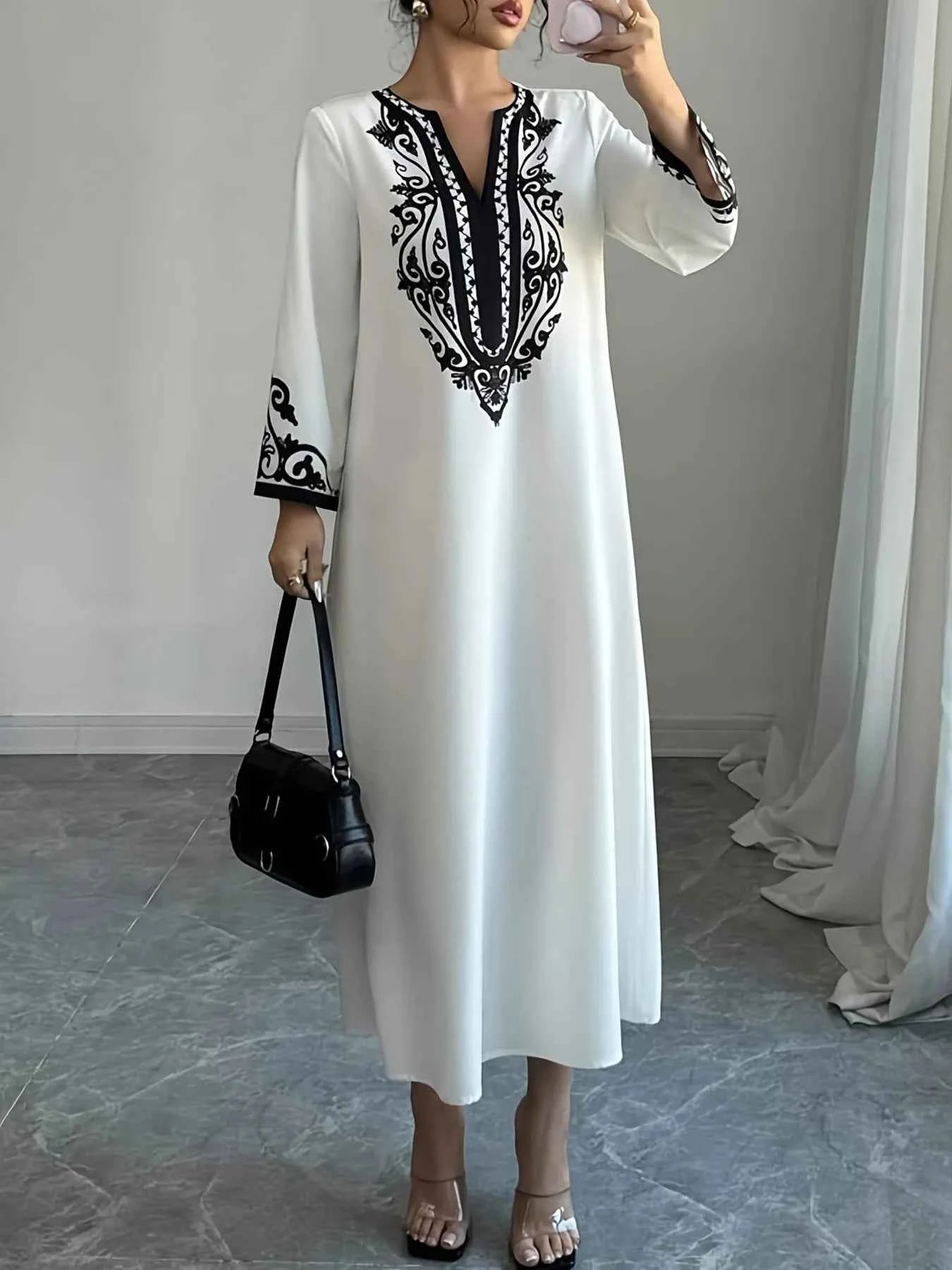 Printed Notched Long Sleeve Midi Dress -