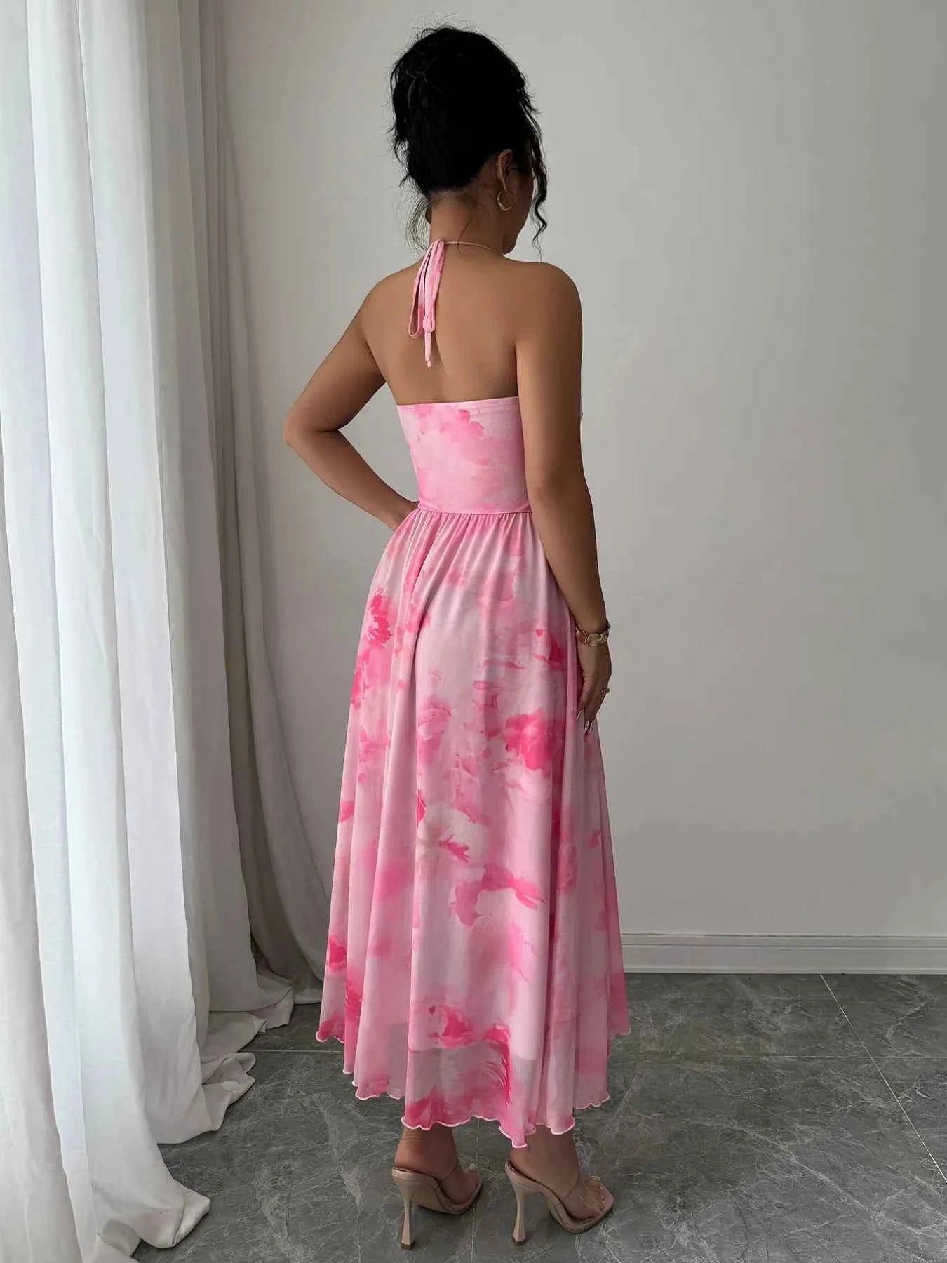Tie-Dye Halter Sleeveless Midi Dress -