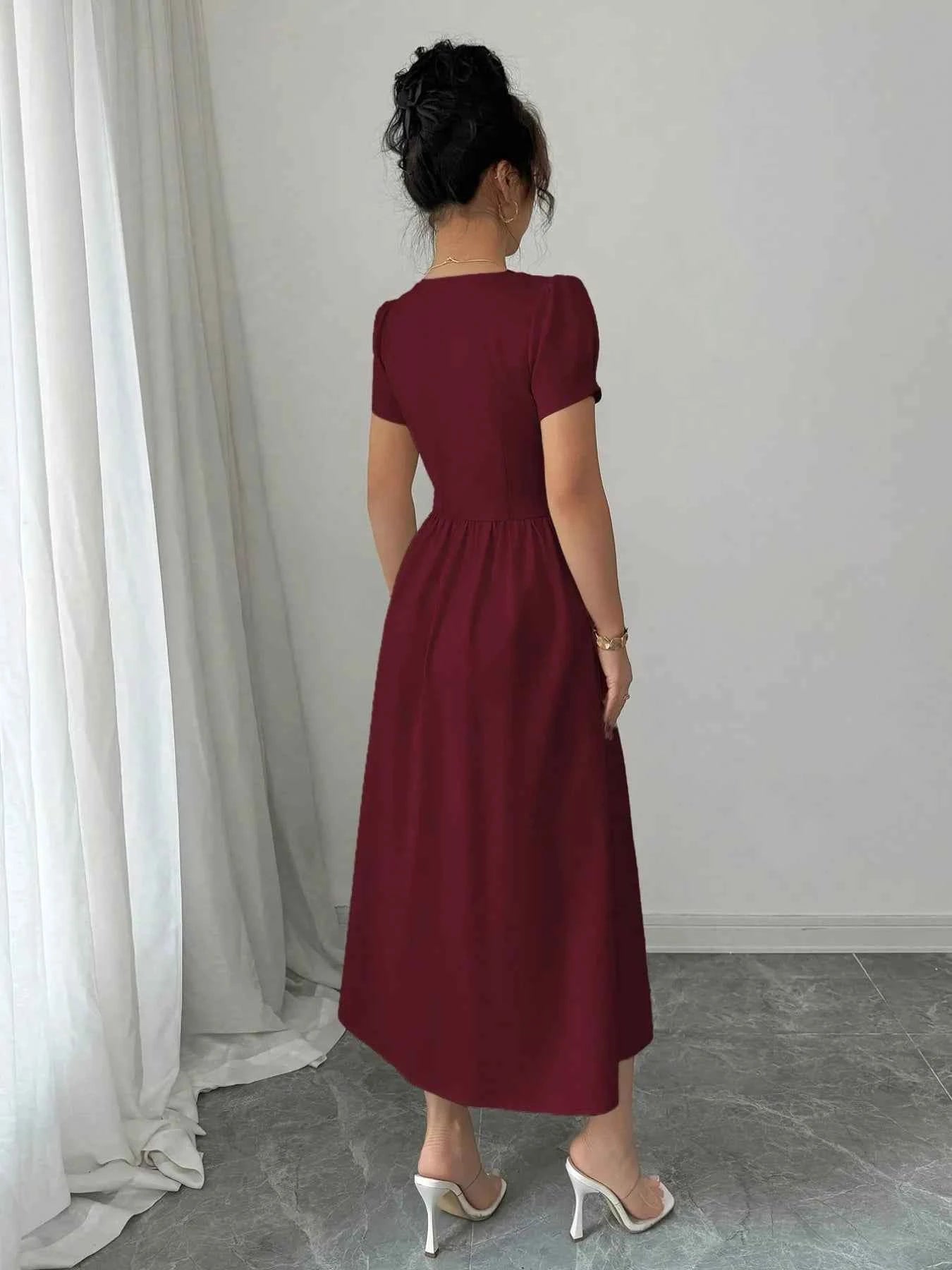 Square Neck Puff Sleeve Midi Dress -