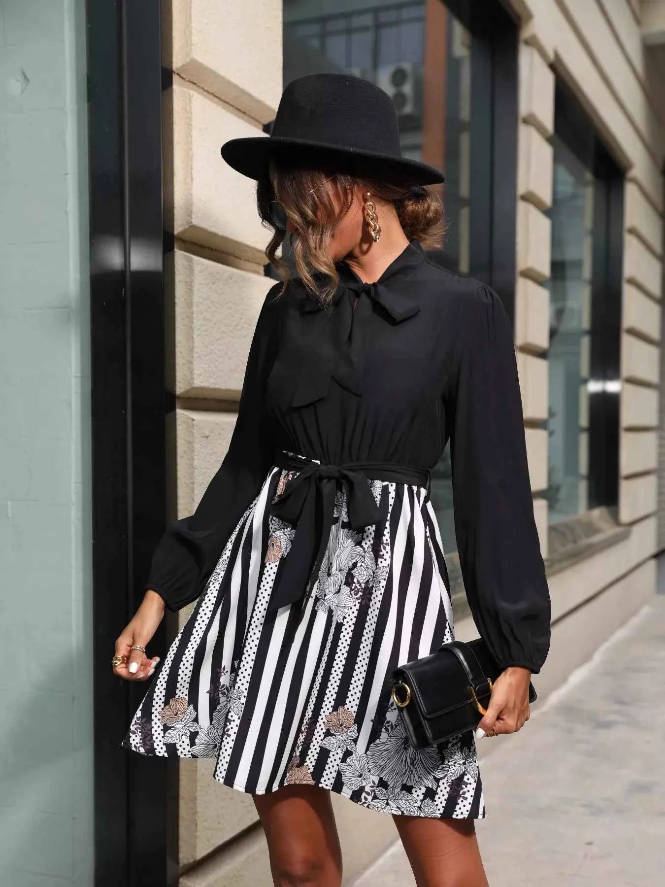 Floral Print Tie Neck Long Sleeve Mini Dress Floral Print Tie Neck Long Sleeve Mini Dress