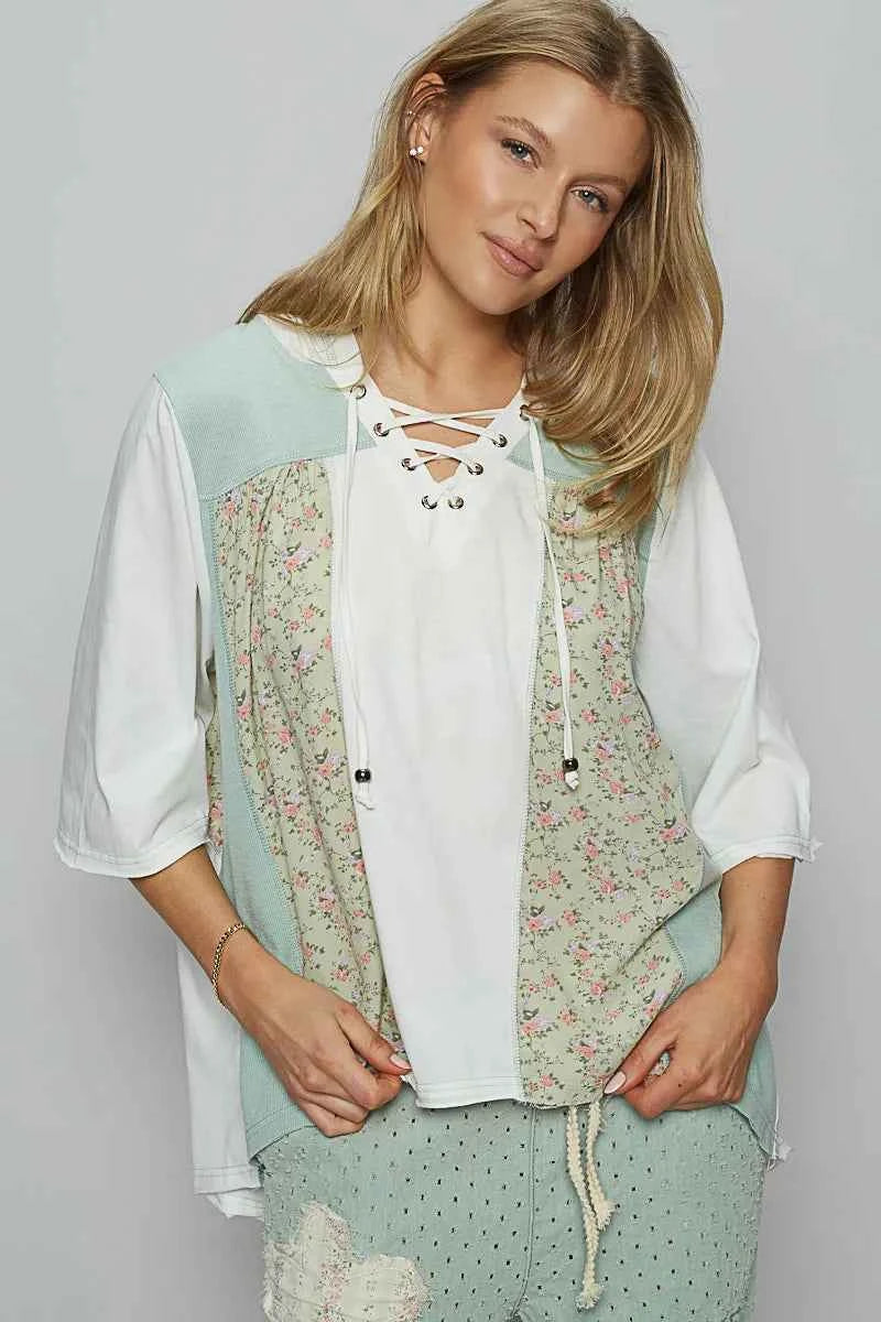 POL Lace-Up Hooded T-Shirt with Paisley Panel Detail POL Lace-Up Hooded T-Shirt with Paisley Panel Detail