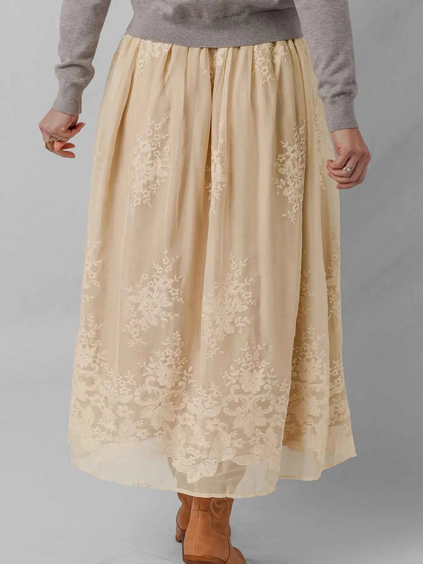 Embroidered Mesh Overlay Flowy Midi Skirt Embroidered Mesh Overlay Flowy Midi Skirt