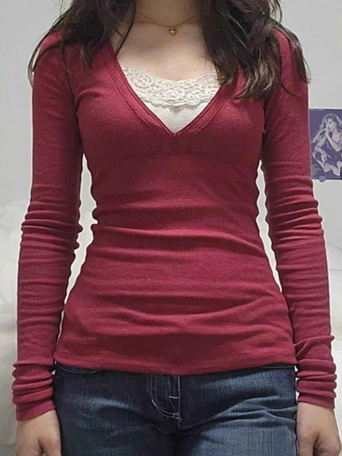 Lace V-Neck Long Sleeve T-Shirt -