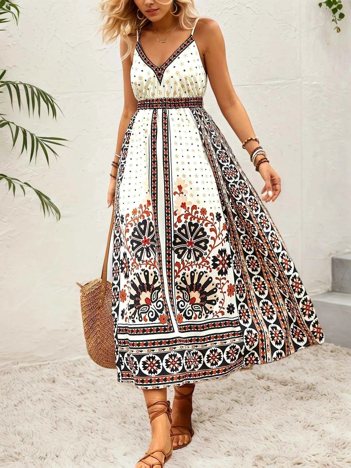 Printed V-Neck Midi Cami Dress