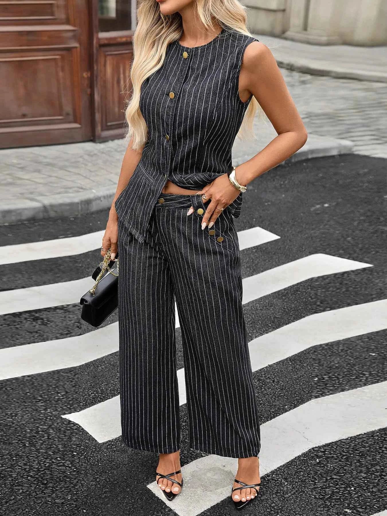 Striped Button Down Tank and Pants Denim Set Striped Button Down Tank and Pants Denim Set