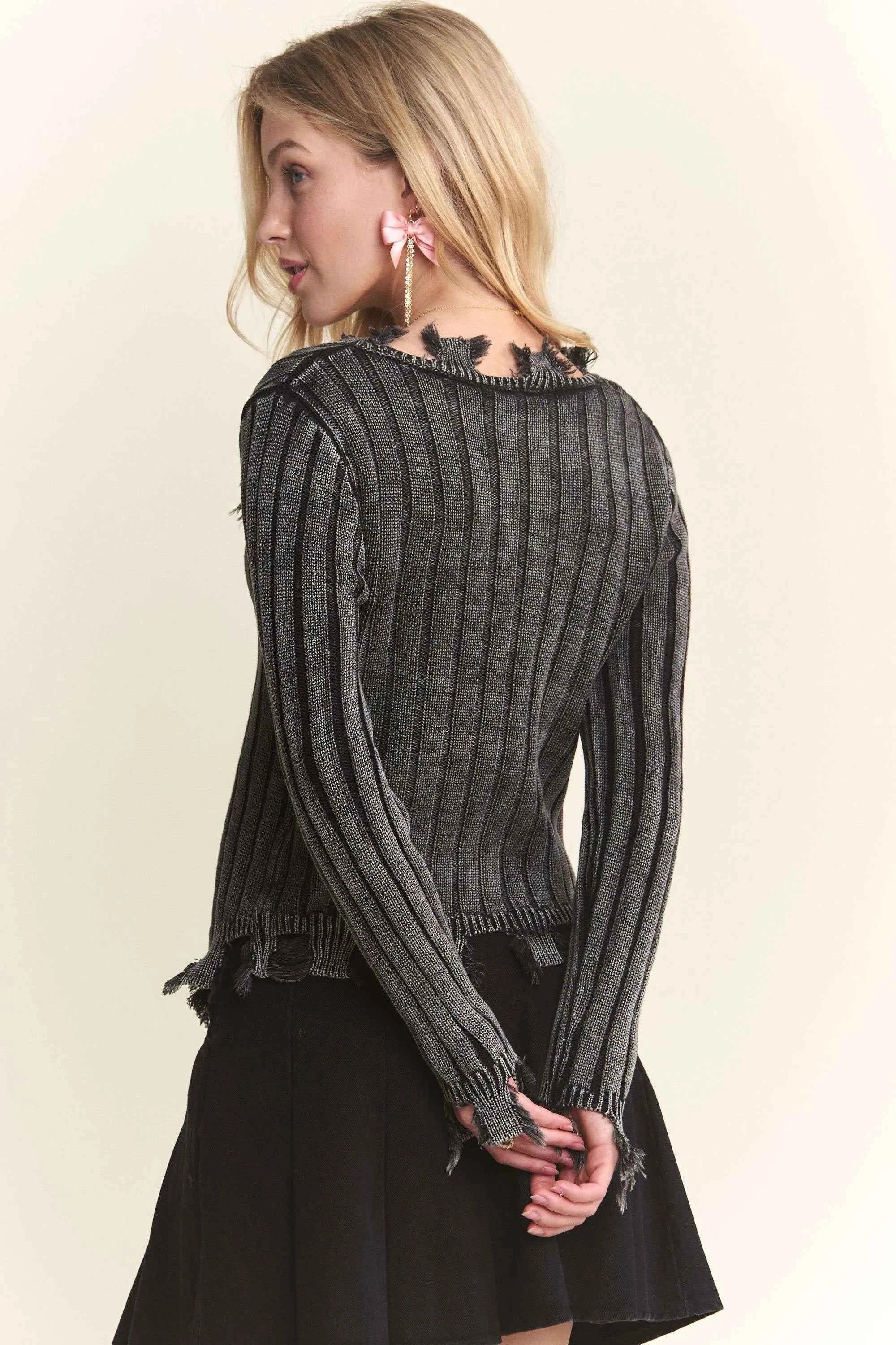 The distressed edge washed sweater is a trendy and edgy addition to your closet. The distressed edges give this sweater a cool and laid-back vibe, perfect for a casual and stylish look. The washed effect adds a vintage and worn-in feel to the sweater, adding to its unique charm. Pair it with your favorite jeans or leggings for a relaxed yet fashionable outfit. Embrace the rugged and casual appeal of this distressed edge washed sweater for a modern and trendy ensemble.