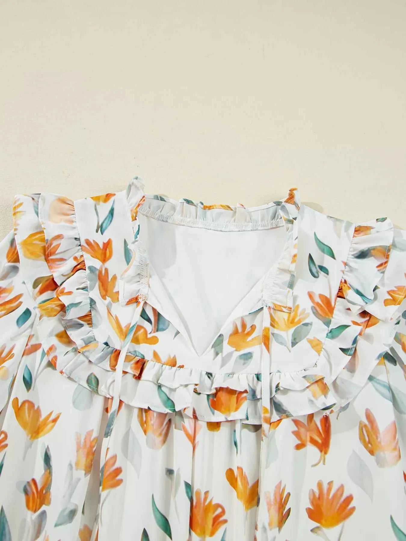 Floral Print Tie Neck Frilled Detail Long Sleeve Mini Dress
