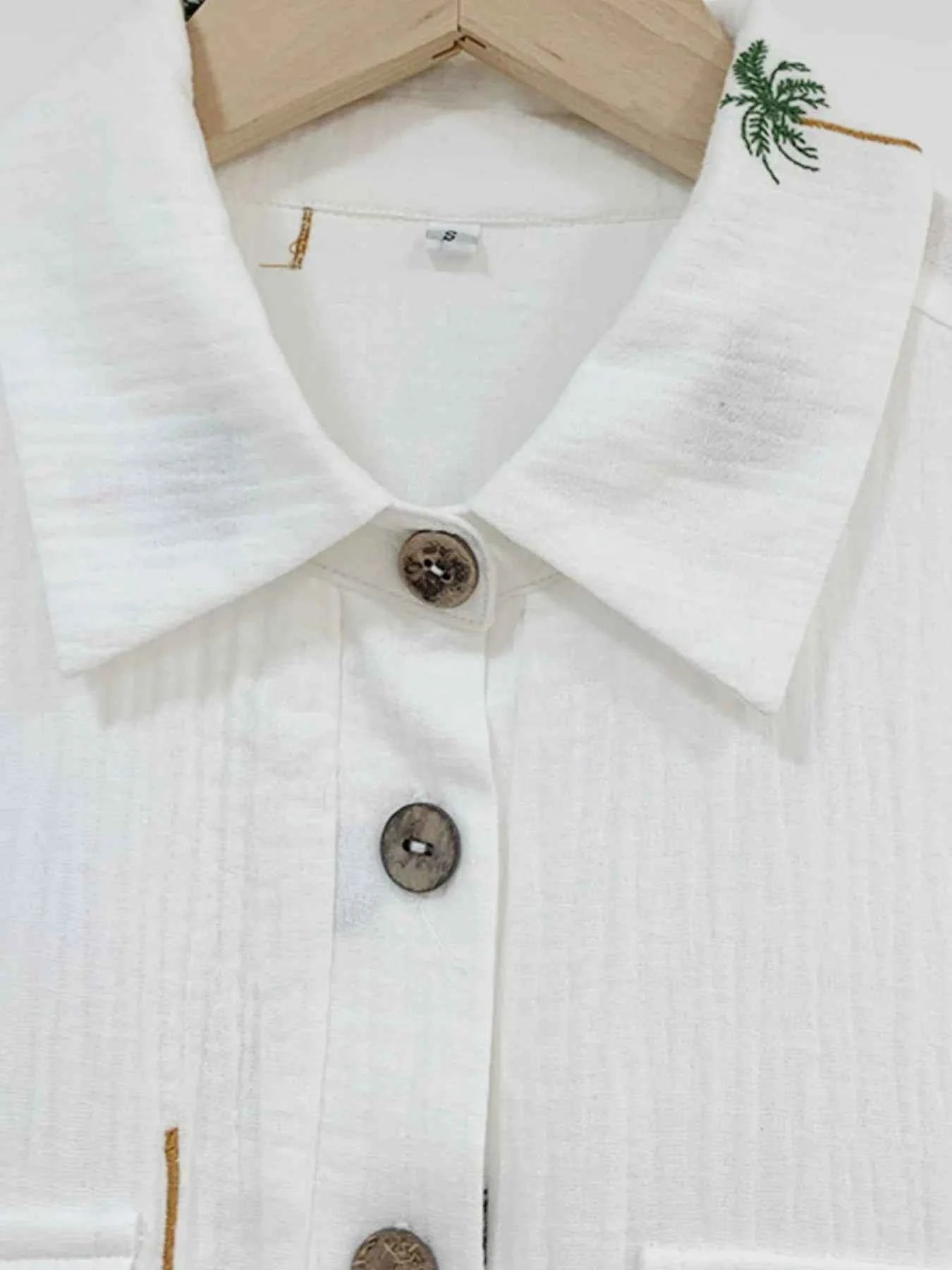 Palm Tree Print Short Sleeve Button-Up Romper with Belt