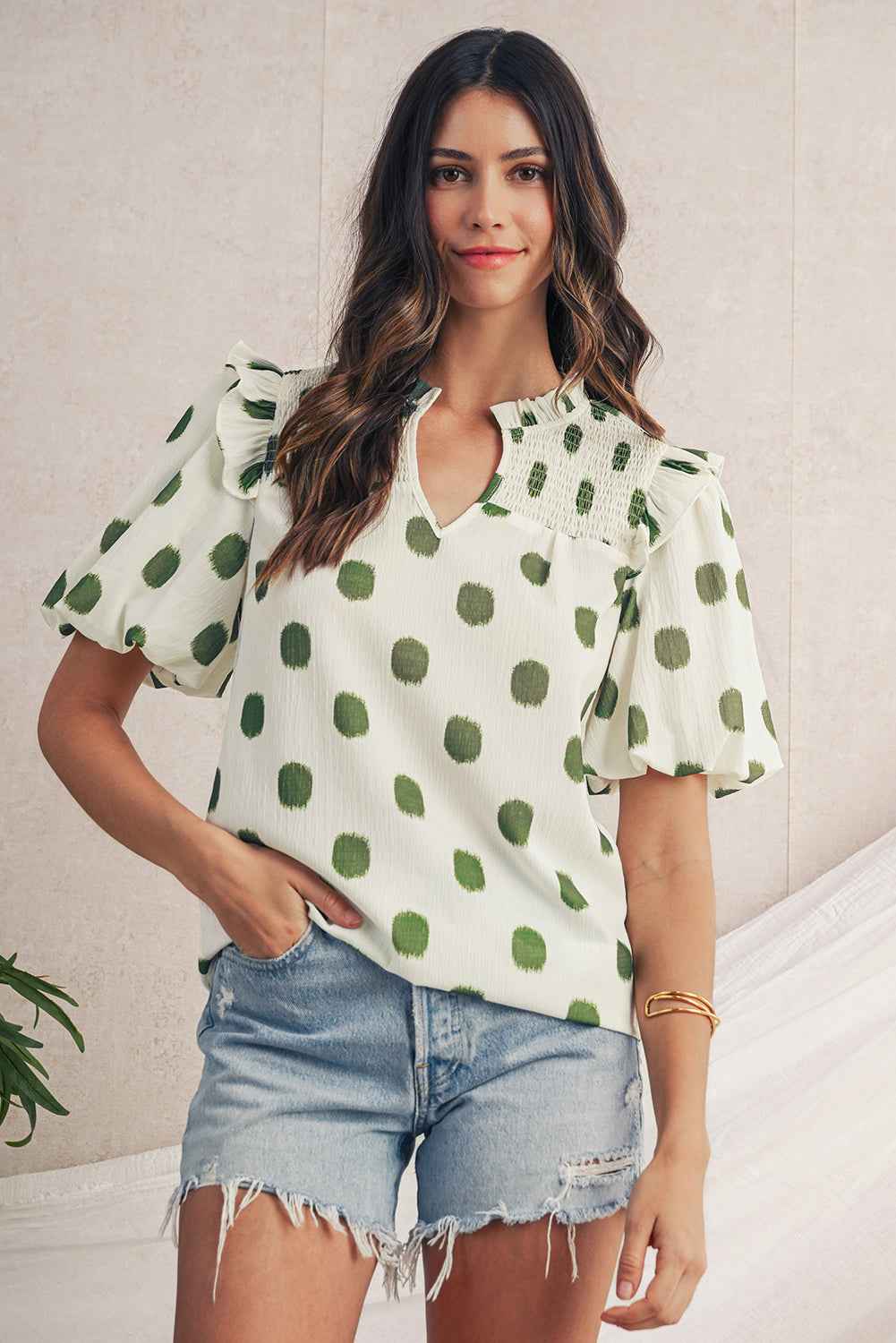 Rose Polka Dot Print Shirred Notched Neck Puff Sleeve Blouse