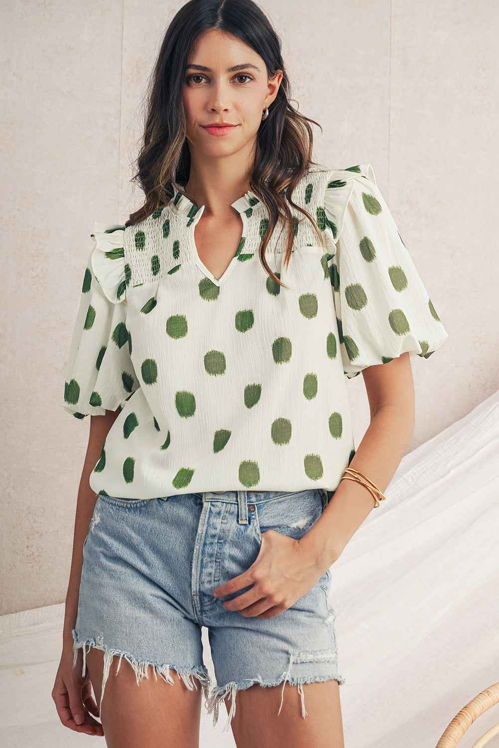 - Ruffles on shoulder, shirred yoke and balloon sleeve.