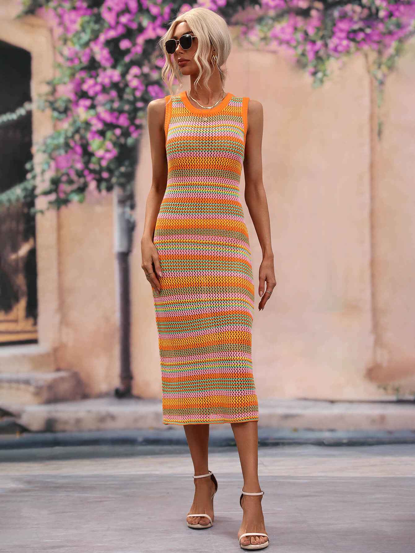 Striped Round Neck Sleeveless Midi Cover Up Dress