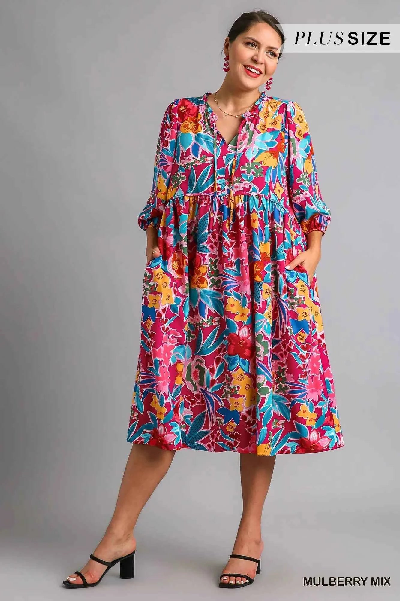 Umgee Full Size Floral Print Tie Neck Midi Dress with Pockets Plus Size MULBERRY MIX 4744bbce-cca0-4538-a462-bafd565231dc-Max-Origin